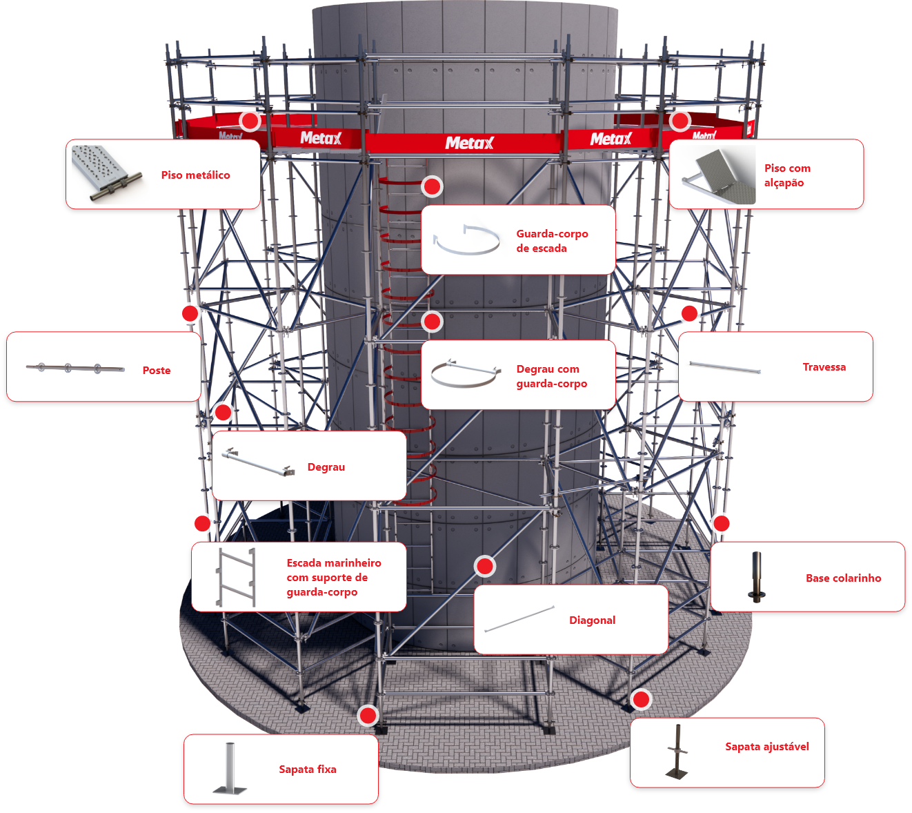 Com o sistema de roseta, a cada 50 cm, permite encaixes precisos com ângulos de 45º e 90º. Isso garante que a montagem seja sólida e segura.
